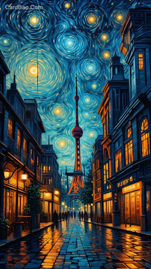 Van Gogh's Starry Night, Shanghai street, street view, distant view, low-angle shot.