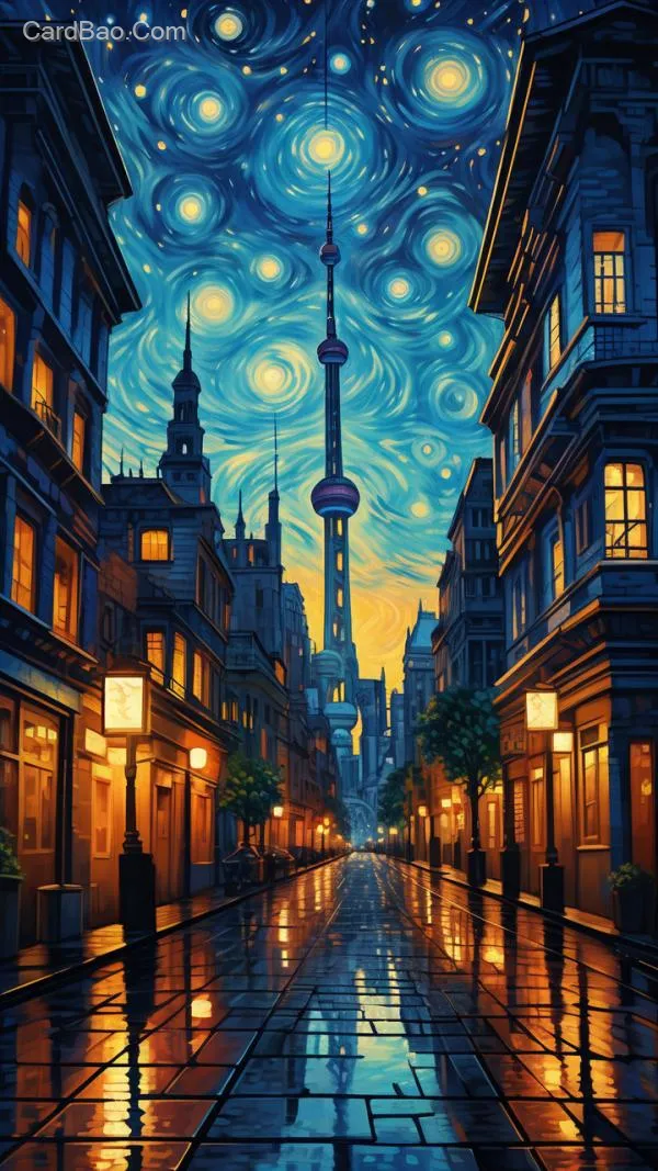 Van Gogh's Starry Night, Shanghai streets, street view, distant view, low-angle shot.