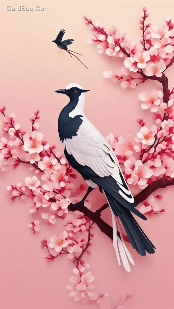 Minimalist Chinese-style landscape vector illustration. A magpie perched on a plum blossom branch, set against a pink background, featuring a flat, paper-quilling-inspired pattern.