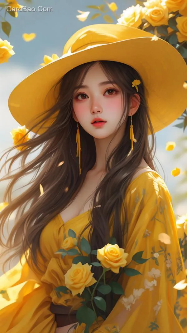 漂亮女孩,长发,五官精致,身穿黄色的裙子,戴黄色帽子,手捧一束黄玫瑰,黄玫瑰背景,小清新,治愈风,唯美