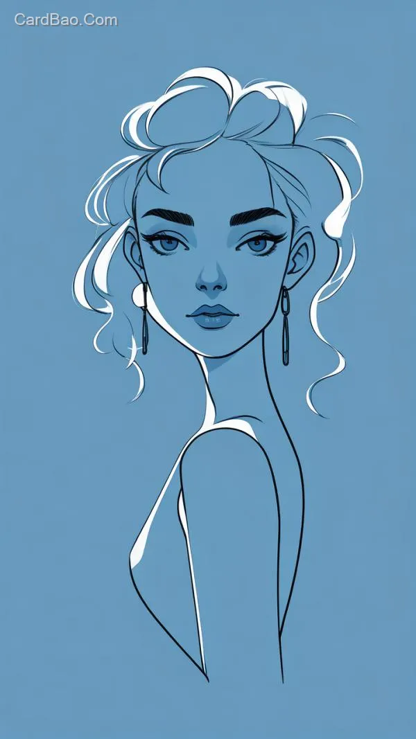 手绘插画风,极简,头像,宝蓝色背景,白色的人物剪影,卡通,少女侧脸,大波浪长卷发,线条