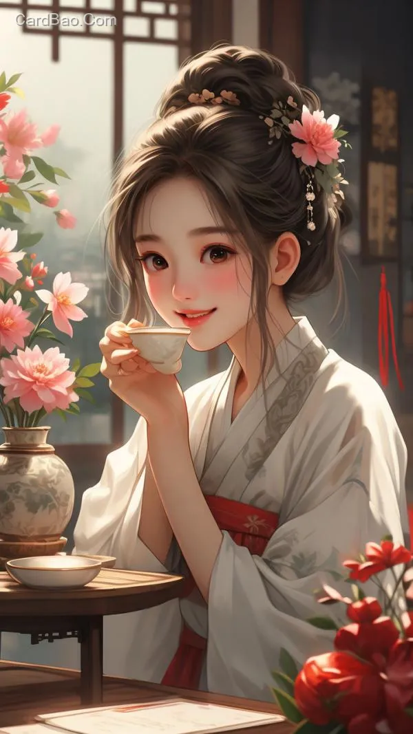 一个甜甜微笑的真人小姐姐,背景茶,香,花,美食