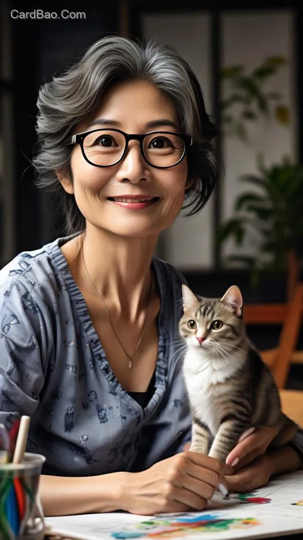 I am a middle-aged retired woman who wears glasses, enjoys keeping cats, and loves painting.