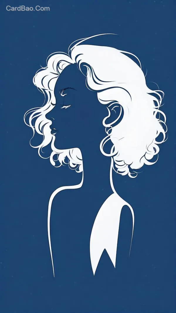 手绘插画风,极简,头像,宝蓝色背景,白色的人物剪影,卡通,少女侧脸,大波浪长卷发,线条