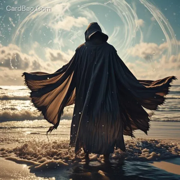 European and American man in a cloak from the back, fish swimming inside a large water sphere, sandy beach, magical special effects.