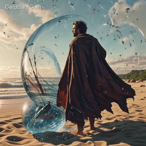 European man in a cloak from behind, fish swimming in a large water sphere, sandy beach, magical special effects.