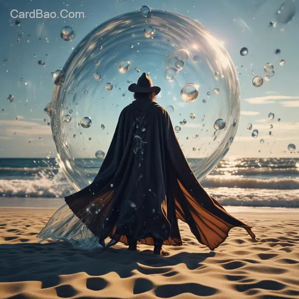European and American male in a cloak from behind, fish swimming in a large water sphere, sandy beach, magical special effects.