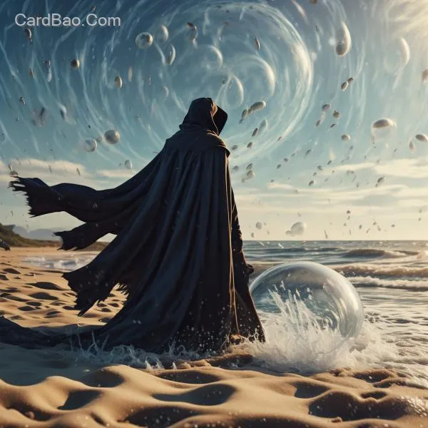 European and American man in a cloak from behind, a large water sphere filled with many fish, sandy beach, magical special effects