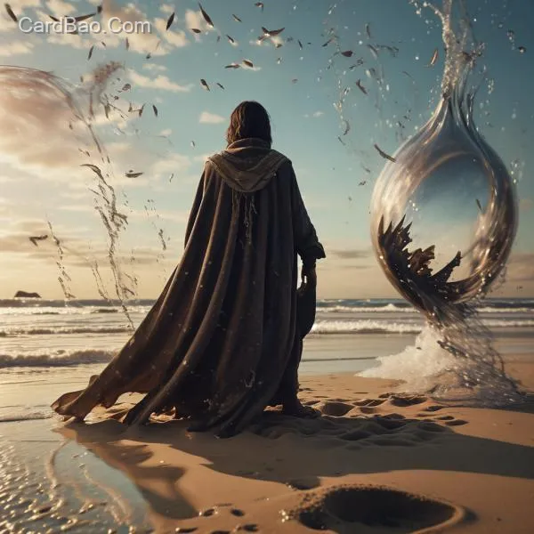 A European man in a cloak from behind, fish inside a large water sphere, a sandy beach, magical special effects.