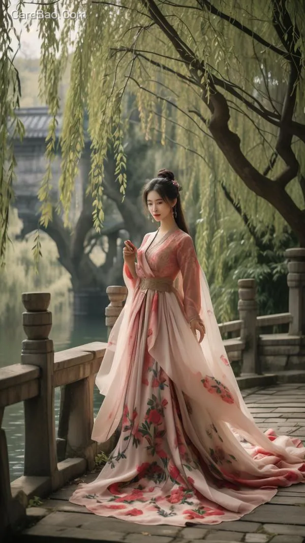古装美女,站在石桥边,桥边柳树成行