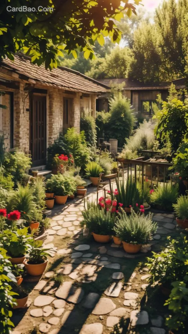 A clean and tasteful farmhouse courtyard, where plants are bathed in sunlight, full of vitality.