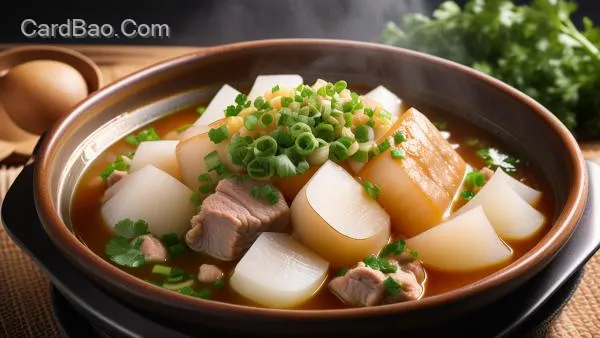 Food display, braised pork belly with white radish, steaming hot, commercial advertising photography, high definition.