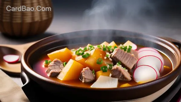 Food display, radish stew with meat, steaming hot, commercial advertising photography, high definition.