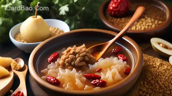 Food display, silver ear fungus, snow pear, and goji berry soup, steaming hot, commercial advertising photography, high definition.