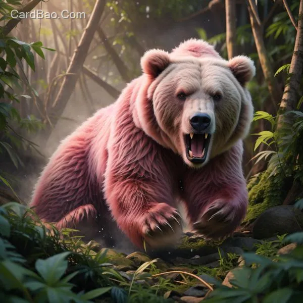 A fierce pale pink bear tumbles onto its back in the jungle, writhing in agony.
