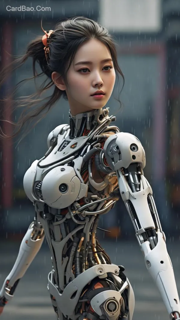Beauty, mechanical implants, dance pose, full-body shot, long shot, robust and full physique, slender and well-proportioned figure.