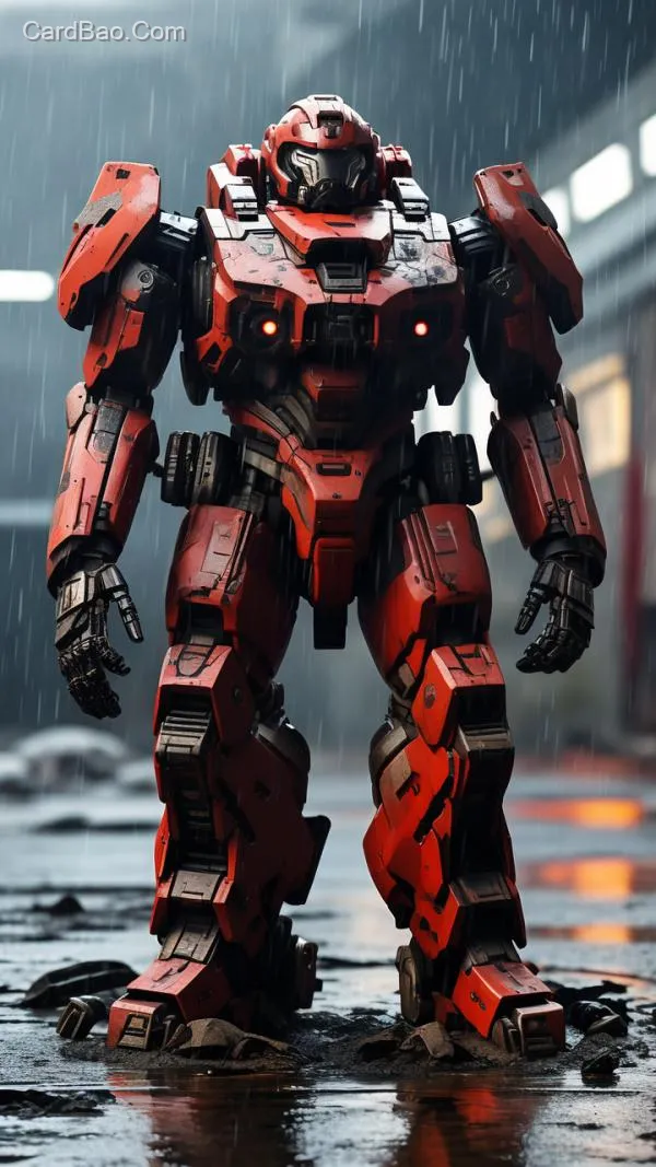 机甲,机体,光环士官长,特写镜头展示 ,真实,锈迹,工业,环境光,下雨天,上半身特写,近距离,狂暴状态,红色机甲