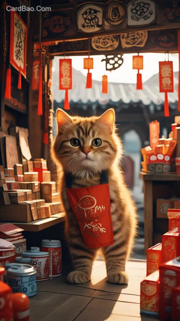 .摄影风格,农村集市上,一只穿着围裙的橘猫站在摊位后面,摊位上整齐地摆放着一堆堆春联。猫的围裙上印有可爱的橘猫图案,摊位上还挂着一个手写的招牌,上面写着“2025蛇年春联批发”
