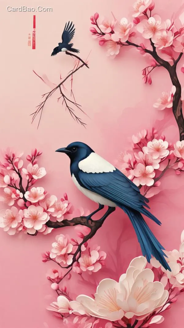 Minimalist Chinese-style landscape vector illustration. A magpie perched on a plum blossom branch, set against a pink background, featuring a flat, paper-quilling-inspired pattern design.