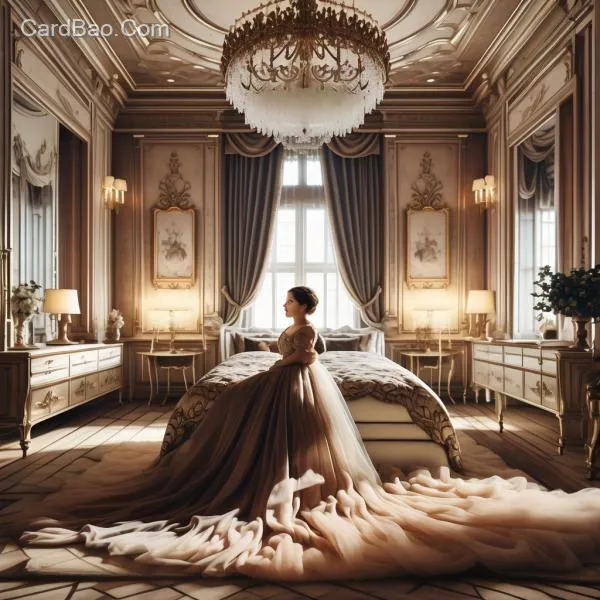 Luxurious European classical bedroom, a baby girl in a wide gauze skirt