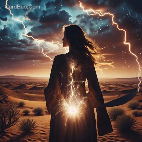 European and American woman's back, holding a glowing orb, lightning, magical effects, desert
