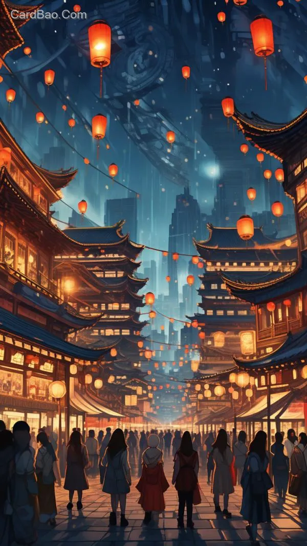 在长安古街上画面:繁华的长安城夜景,灯火璀璨,热闹的市集人潮涌动。旁白:"在繁华的长安城,灯火辉煌,市集上熙熙攘攘,热闹非凡。"动漫风格