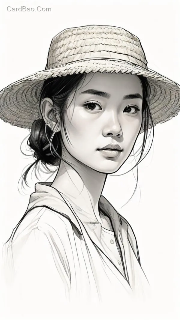Farmer sister wearing a straw hat, line sketch drawing, simple pen sketch