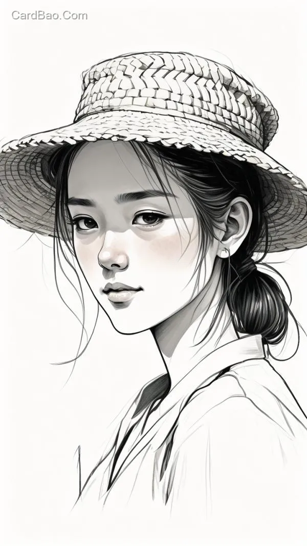 戴草帽的农民阿姐,线条手稿绘画,简单钢笔手稿