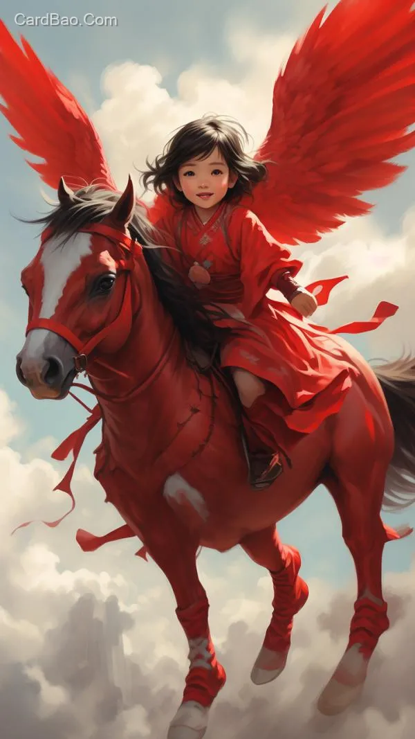 A little girl in a red robe rides a winged horse with spread wings, walking through the sky.