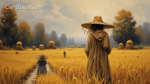带着帽子的稻草人,背影,黄色的稻谷堆,远处一排稀疏的树,油画,莫奈印象风格。