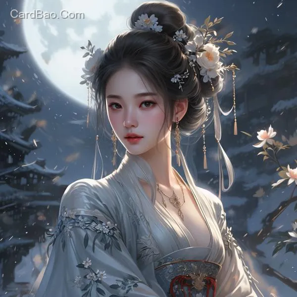 Ancient beauty, exquisite facial features, stunning makeup, fair complexion, hair buns, wearing ancient attire, full body, panoramic perspective, fantasy world, soft lighting, front view, serene and cool, moonlight, cosmic stars.
