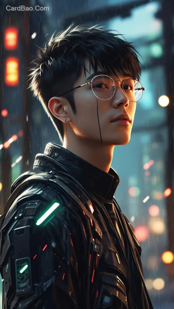 Cyberpunk style, surreal, dreamlike colors, handsome boy, short black hair, wooden-frame glasses, single eyelids, slightly square face shape, sunny and cheerful smile, tree shade, fantasy art cover illustration, high contrast, wide-angle lens, distant view, side lighting, 4K ultra-high definition, delicate light and shadow.