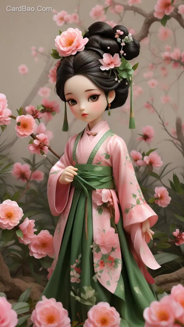 桃花娃娃Q版 粉色头发,绿色裙子 国潮 手办 高清特写 全身 可爱 细节丰富 草地背景