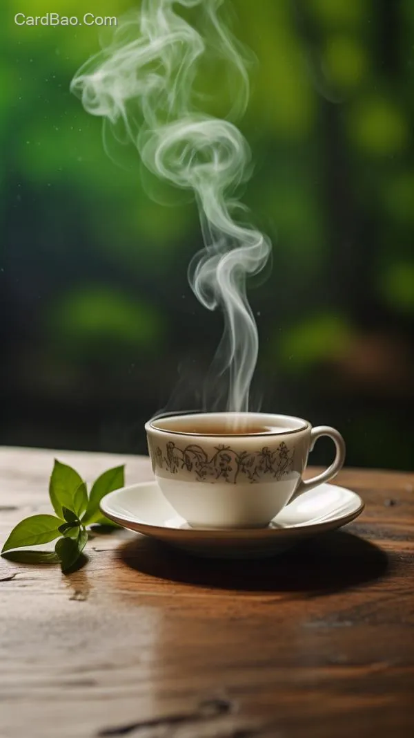 图片中有一杯清茶置于木桌之上,背景为模糊的绿色景象。