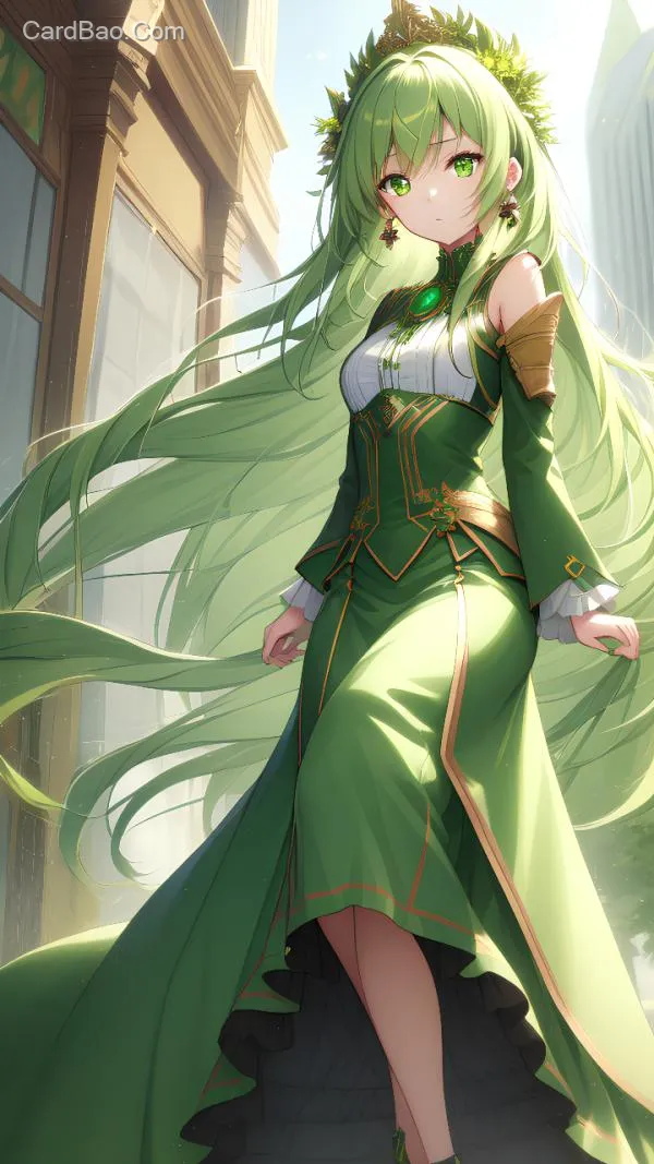 立绘,少女,绿色瞳孔,繁华都市,黑绿色长发,大小姐,绿色外套,白色和淡绿色连衣裙,麦穗装饰,温柔治愈