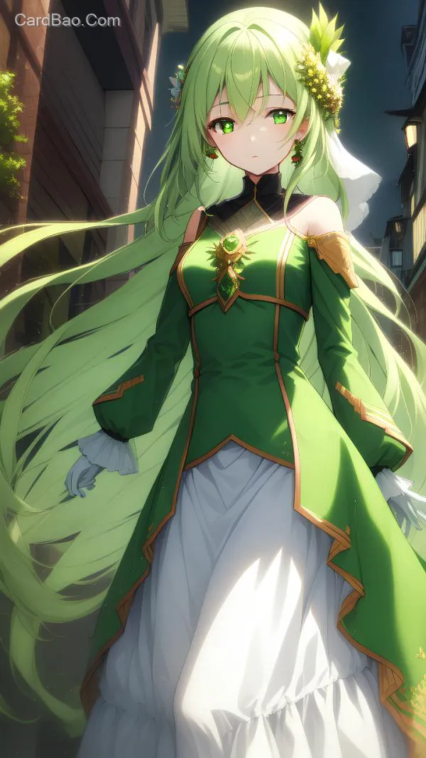 立绘,少女,绿色瞳孔,繁华都市,黑绿色长发,大小姐,绿色外套,白色和淡绿色连衣裙,麦穗装饰,温柔治愈