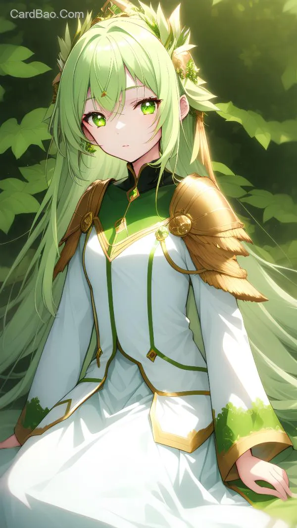 立绘,少女,绿色瞳孔,深绿色长发,大小姐,绿色外套,白色和淡绿色连衣裙,麦穗装饰,温柔治愈