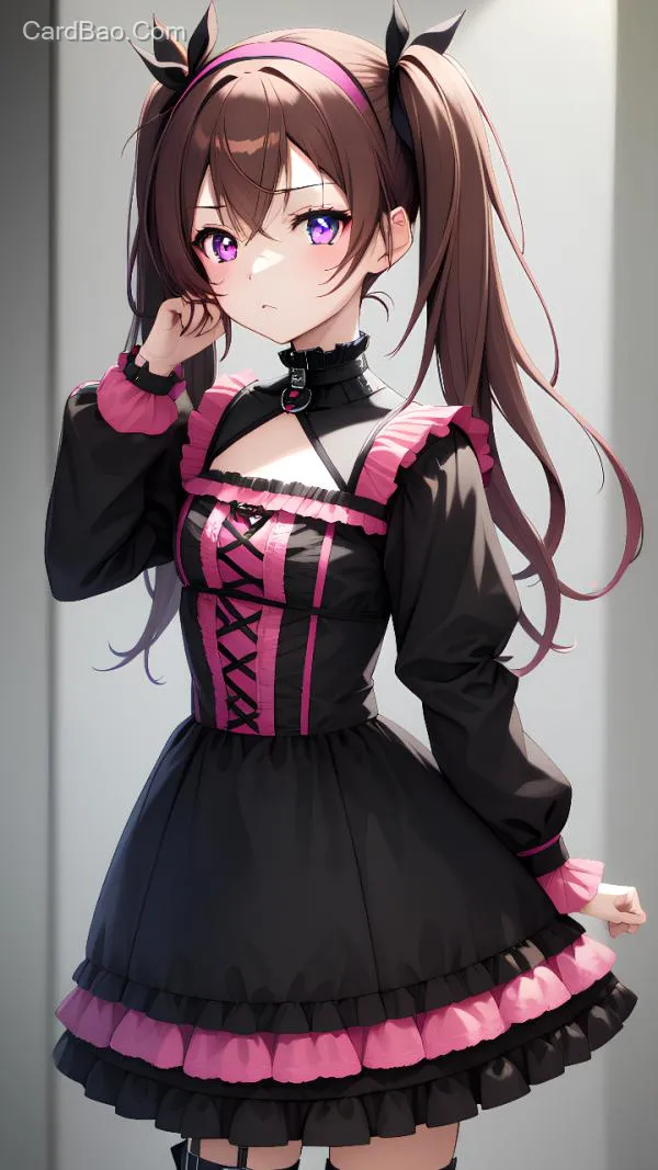 立绘,少女,棕发,双马尾,蓝瞳,绷带,地雷系装扮,粉黑色哥特风,黑色发带