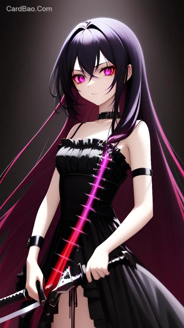 黑色长发少女紫色瞳孔黑红剑立绘黑紫礼服战斗绑带锁链装饰全身冷酷红色侧发挑染