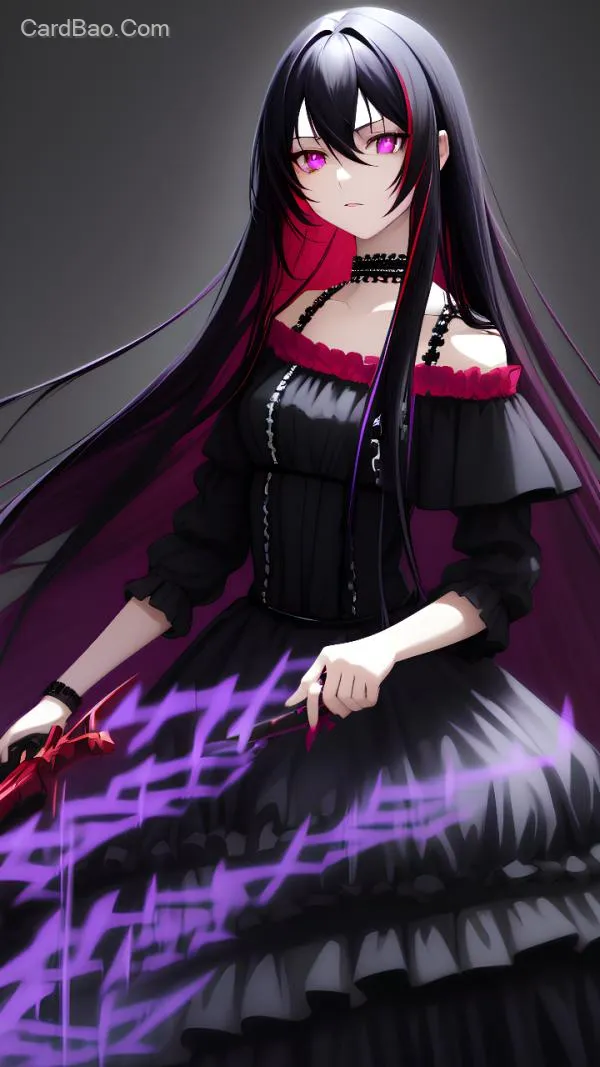 A black-haired girl with purple pupils, holding a black and red sword, in an illustration. She wears a black and purple gown, adorned with combat straps and chains all over her body, exuding a cold demeanor, with red highlights in her hair.