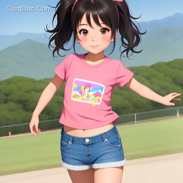 Song Yue Leshui, a little girl is running with a happy expression, wearing a pink short-sleeved shirt and blue denim shorts, with a mountaintop and rocks in the background.