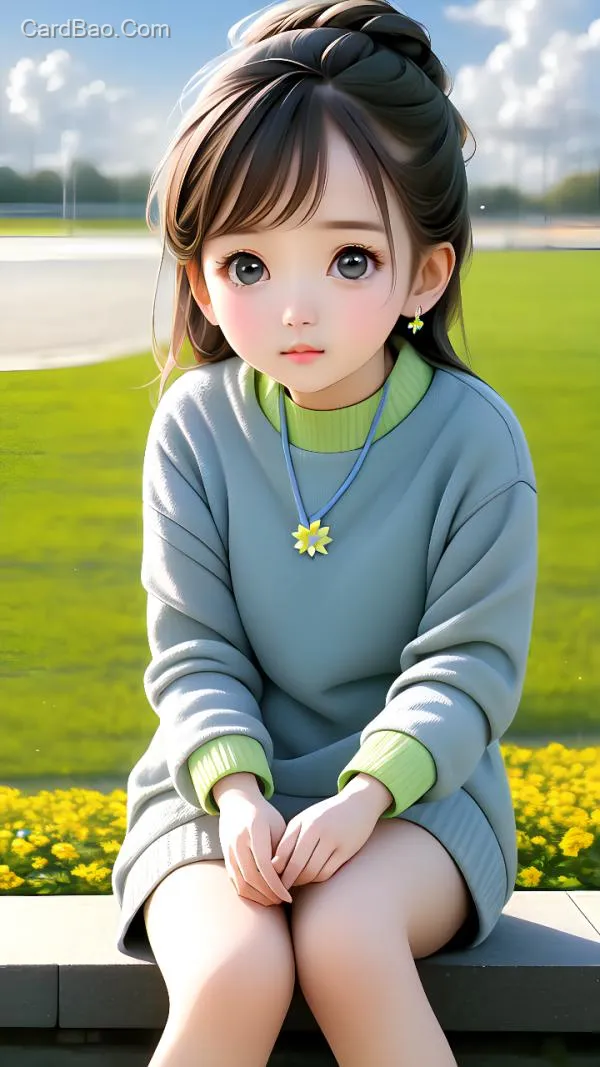 Cute girl, bright summer, blue sky with white clouds, beautiful woman with flowers, ultra-high definition details.