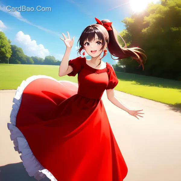 一个有马尾辫,穿着红色连衣裙,站在阳光下,挥手的开心女孩