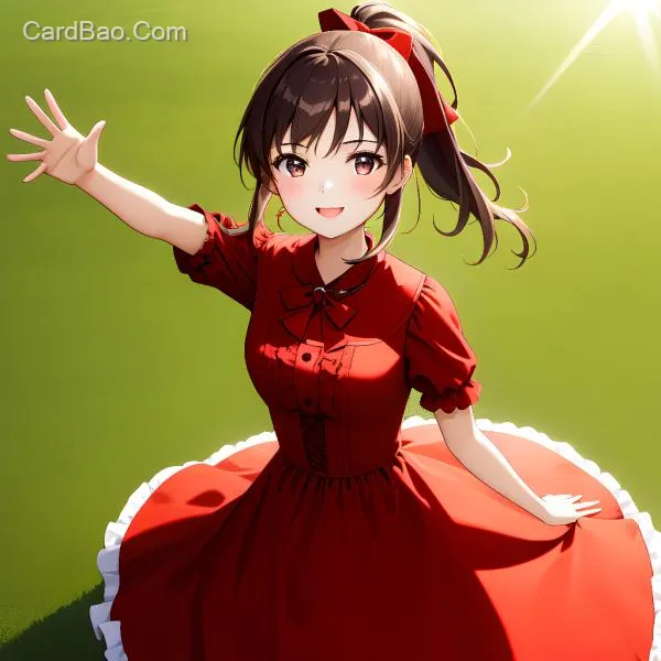 一个有马尾辫,穿着红色连衣裙,站在阳光下,挥手的女孩