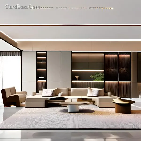 高画质,低饱和度,8K,高清,室内设计,现代简约风格,客厅空间,沙发,电视,电视柜,线性灯,落地灯,地毯,大理石茶几,绿植,暖灰色调,落地窗,窗帘,无主灯设计,矩形吊顶,