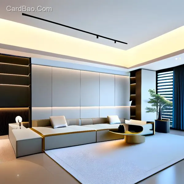 高画质,低饱和度,8K,高清,室内设计,现代简约风格,客厅空间,沙发,电视,电视柜,线性灯,落地灯,地毯,大理石茶几,绿植,暖灰色调,落地窗,窗帘,无主灯设计,矩形吊顶,
