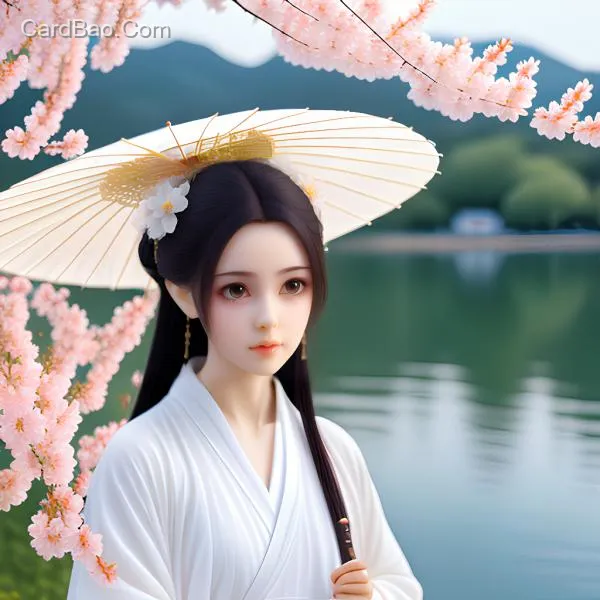 By the West Lake, peach blossoms are in full bloom and green willows cast their shade. A young maiden, holding a delicate silk umbrella, stands on the shore admiring the swallows and sparrows flitting about over the lake's center.