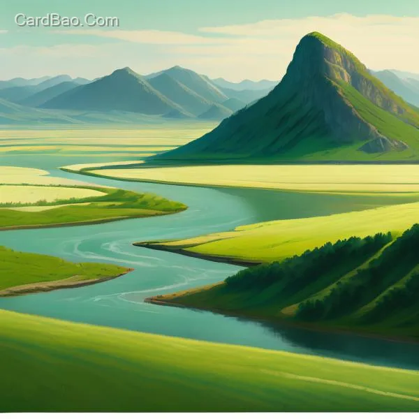 春天,平原,大地翠绿,远处高山巍峨,一条大河蜿蜒而来,一座桥横亘在河上