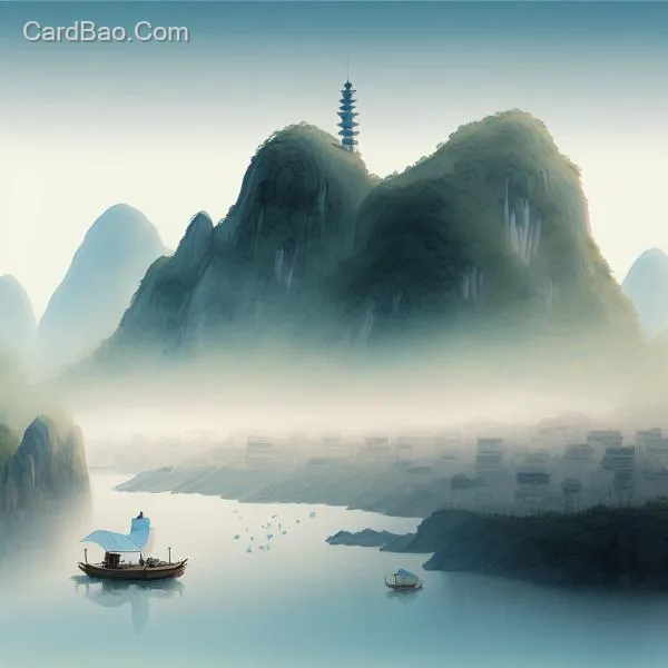 White background Chinese landscape illustration, with mountains in green and blue, rendered, high detail, ultra-high quality, high resolution, Chen Jialing, Song Huizong, artistic ink wash, minimalist, textured matte, diffuse gradient, Gaussian blur. A serene Wu Guanzhong-style illustration depicts a river journey inspired by Li Bai's poetry. Soft blues and grays create an ethereal atmosphere, with figures departing from Baidi City. Mist-shrouded mountains and a tranquil river are captured with delicate lines, evoking a sense of timeless beauty and introspection. The melody of nature resonates in the air, inviting the viewer to immerse themselves in the peaceful journey.