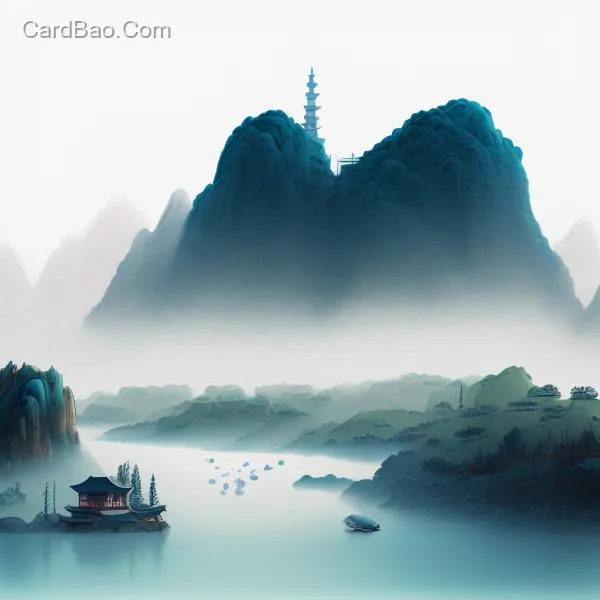 白色背景中国风景插图,山脉是绿色和蓝色,渲染,高细节,超高质量,高分辨率,陈家泠,宋徽宗,意境水墨,极简,肌理磨砂,弥散渐变,高斯模糊